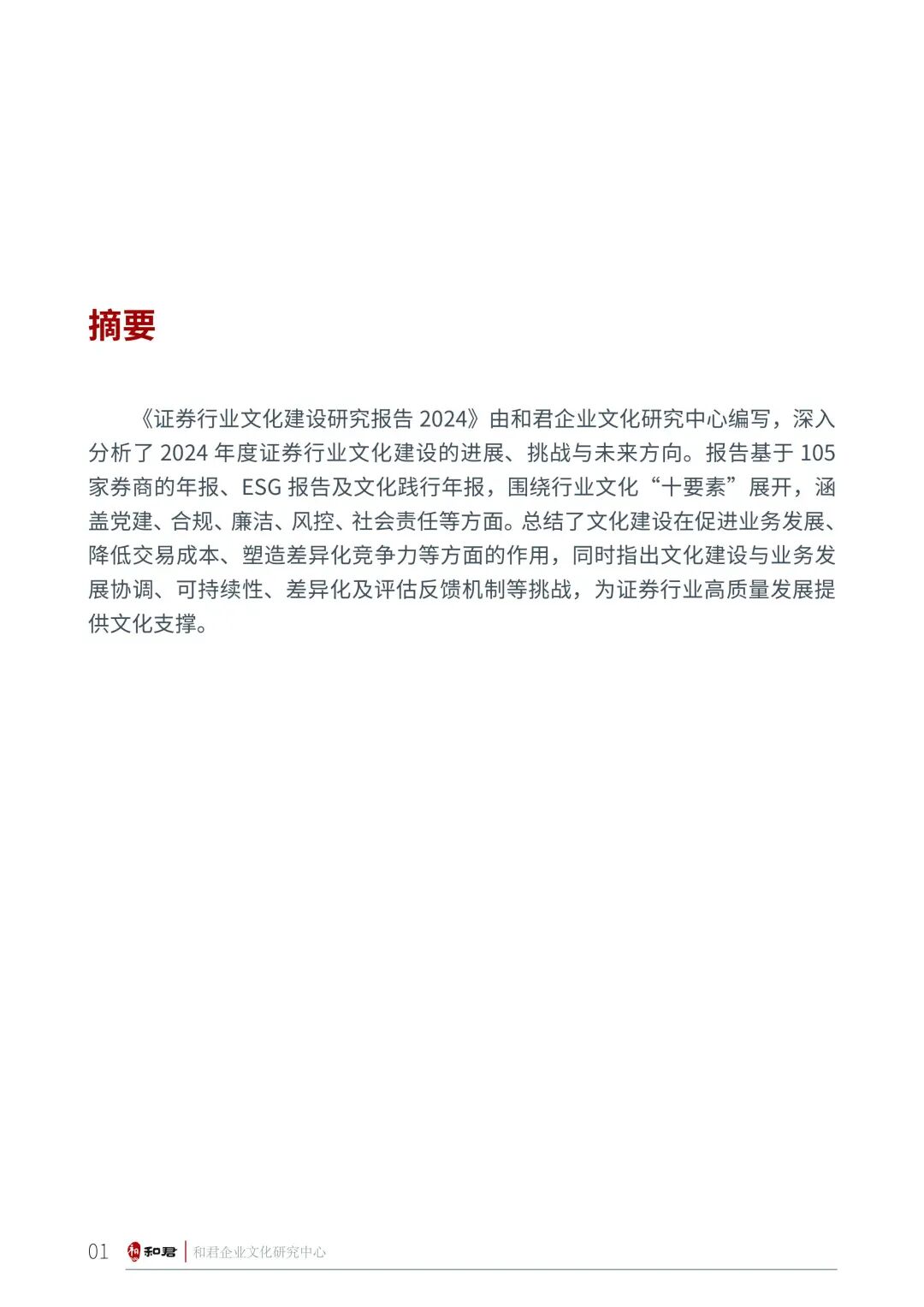 和君企业文化研究中心正式发布《证券行业文化建设研究报告》,深入分析2024年度证券行业文化建设的进展、挑战与未来方向。报告基于105家券商的年报、ESG报告及文化践行年报,围绕行业文化“十要素”展开,涵盖党建、合规、廉洁、风控、社会责任等方面。总结了文化建设在促进业务发展、降低交易成本等方面的作用,同时指出文化建设与业务发展协调、可持续性、差异化及评估反馈机制等挑战,为证券行业高质量发展提供文化支撑。