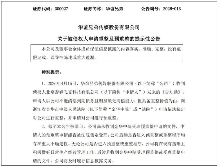 2026年4月15日,一则公告将华谊兄弟推至悬崖边缘——债权人北京泰睿飞克科技有限公司以“不能清偿到期债务且明显缺乏清偿能力”为由,向法院申请对公司进行重整及预重整。触发重整申请的债务本金,仅为1140.52万元。