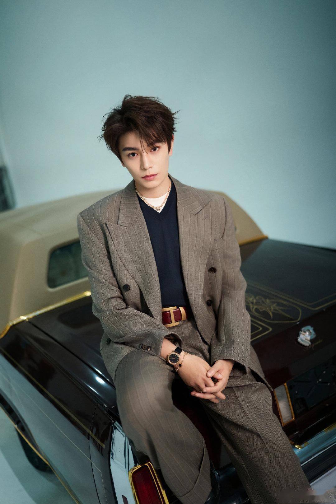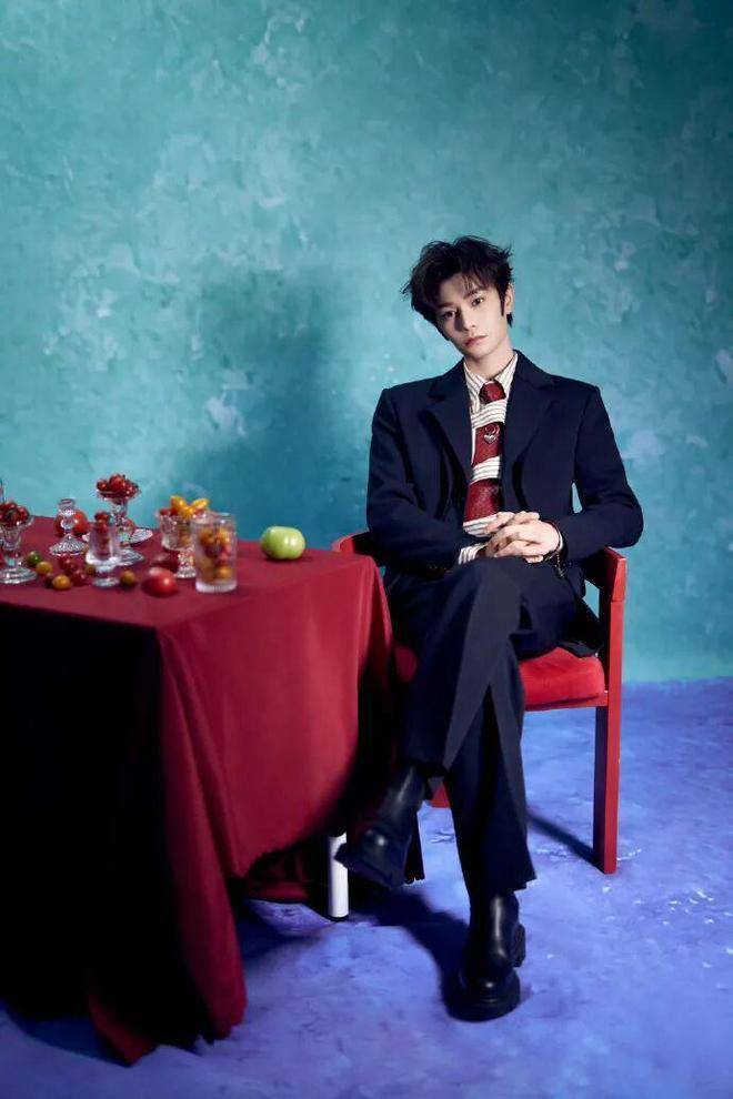 除了衣服本身,他的搭配细节也值得抄作业。比如衬衫领口解开两颗扣子,露出一点点锁骨,少了几分严肃多了几分随性;手表选了简约的金属款,和皮革领带形成材质呼应;就连坐姿都很有讲究,挺直腰背但不僵硬,单手托腮的动作让正式感中带着少年气。这些小细节看似不起眼,却能让整体造型更有呼吸感,不会像“移动衣架”一样呆板。